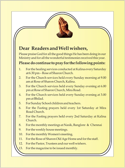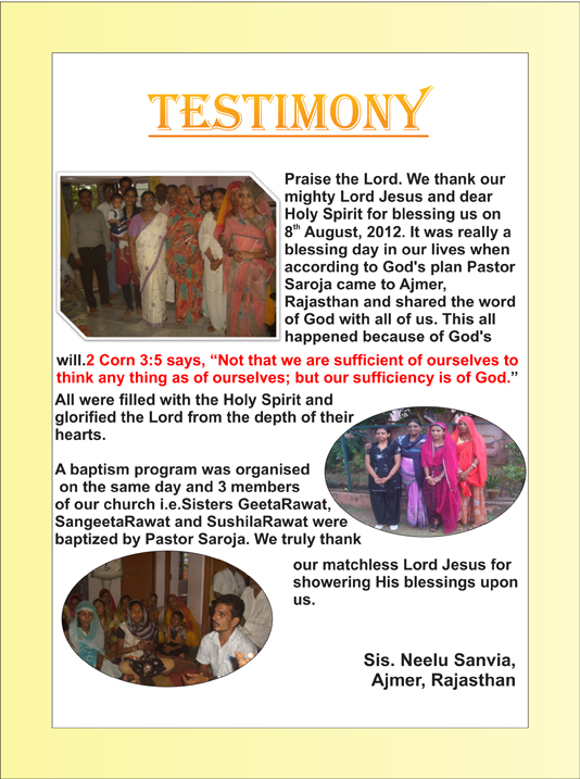 a) I was not feeling well for the last 4 weeks. When Pastor came to Bhilad, I told her of this problem. Pastor prayed for me and God heard His daughter’s prayers and healed me. Now I am perfectly alright.